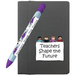 Conjunto de caderno e caneta de mensagens Teachers Shape the Future: vem com 1 caderno Teachers Shape the Future (4" x 6") e 1 caneta giratória Teachers Shape the Future para mensagens. A caneta é uma caneta esferográfica retrátil de 1 mm com tinta preta. Os cadernos contêm páginas pautadas. São lembranças únicas e úteis!