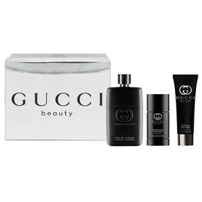O conjunto de presentes Gucci Guilty Pour Homme combina o luxuoso Eau de Parfum (3 fl. oz), desodorante refrescante (2,4 fl. oz) e gel de banho revigorante (1,6 fl. oz). Esse aroma ousado e aromático combina frutas cítricas, lavanda e patchouli para um fascínio masculino moderno. Perfeito para presentear ou dar prazer pessoal, ele incorpora confiança e sofisticação em uma experiência completa de higiene pessoal.