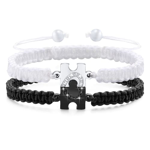 - Pulseiras combinadas à mão para casais: estas pulseiras de casal apresentam um design exclusivo de peça de quebra-cabeça. Quando as duas pulseiras se juntam, as peças do quebra-cabeça se encaixam perfeitamente, formando uma forma completa de coração. E há zircônia cúbica AAA nos pingentes das pulseiras.