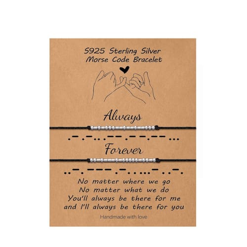 - Pulseira com código Morse: mensagem de código Morse de prata esterlina S925 "ALways & Forever" em uma corrente de cordão. Este é um conjunto de pulseiras para 2, uma para você, uma para mim. Depois de usá-la no pulso, prometo que não importa aonde vamos, não importa o que façamos, sempre estarei lá para você, e tudo ficará OK! Essa é a nossa promessa Pinky!