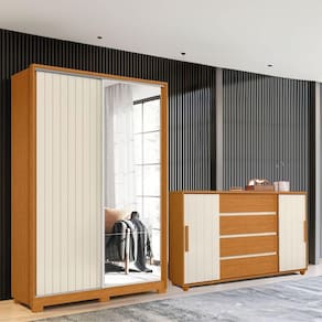 Conjunto De Quarto Guarda Roupas Com Espelho 2 Portas De Correr E Cômoda Hera Flex Madeirado/off Whi Madeir/off