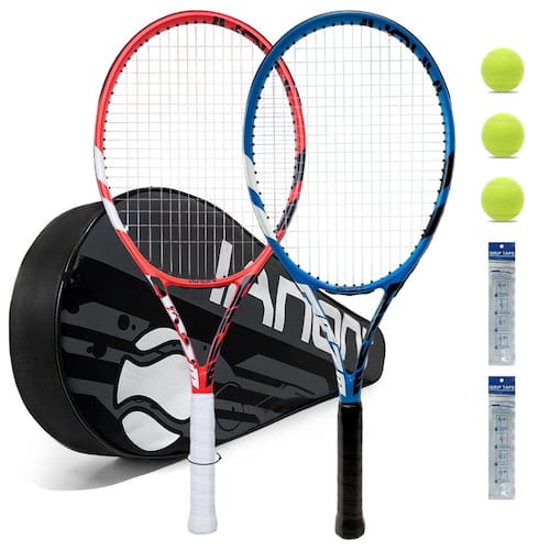 Conjunto de 2 raquetes de tênis para adultos, raquetes de tênis pré-amarradas de 68 cm - conjunto de raquete de tênis para 2 jogadores com 3 bolas, 2 aderências, 2 amortecedores de vibração - azul e - Pacote 8 em 1 – o conjunto de raquete de tênis vem com raquetes de tênis de 5 x 68 cm, 2 bolas de tênis, 2 alças e 1 capa de raquete portátil, adequada para estudantes, amantes, idosos, iniciantes ou jogadores intermediários. - Pré-resistente com a tensão certa – basta fazer o jogo com seus parceiros ao receber o conjunto de embalagem. O cordão de raquete transparente durável tem a quantidade certa de tensão e não perde a tensão facilmente, o que permite que você execute a queda e o salto muito bem. - Tamanho da cabeça grande - 105 SQ. de superfície de tênis grande, você pode bater com mais precisão. - Leve e confortável – cada raquete pesa apenas 300 g, para que você não se sinta cansado após muito tempo de uso e faça você jogar soberbamente no campo. O envoltório overgrip é forte, macio e à prova de choque, menos vibração da raquete protege suas mãos de lesões e ajuda você a jogar mais confortavelmente com amigos ou familiares. - Conjunto de várias ocasiões e presente – pode ser presenteado para seus entes queridos e adequado para a maioria das ocasiões, como quadras de tênis, parques perto de casa ou escritório, praias ou campo de jogos da escola, etc., apenas divirta-se com as raquetes de tênis recreativas em seu tempo livre
