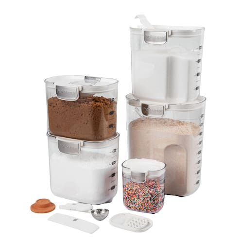 O conjunto hermético de armazenamento de alimentos ProKeeper+ de 9 peças da Progressive combina estrutura de alta qualidade com uma vedação de silicone para armazenamento hermético e um fecho de aço inoxidável para garantir a longevidade dos ingredientes. Os cinco recipientes com acessórios de coordenação são projetados exclusivamente para ingredientes específicos e mantêm o frescor prolongado. Todos os recipientes incluem marcações de medição para exibir claramente seu conteúdo interno. O conjunto inclui um recipiente para farinha, açúcar granulado, açúcar mascavo, açúcar em pó e um versátil "mini". Cada recipiente é dimensionado para caber em um saco padrão de seu ingrediente correspondente. A farinha ProKeeper de 4 litros caberá em um saco padrão de 2,3 kg de farinha. Possui uma barra de nivelamento magnética que se prende ao cesto para uma medição fácil e sem bagunça e se encaixa sob a tampa para armazenamento conveniente. O Sugar ProKeeper de 2,5 litros contém um saco padrão de 1,8 kg de açúcar e tem formato contornado e bico virado para despejar facilmente com uma mão. O açúcar mascavo de 1,5 litros contém um saco padrão de 900 g de açúcar mascavo e uma tampa que abriga um disco de terracota removível quando, embebido em água e colocado com o açúcar mascavo, garantirá que o açúcar permaneça macio. O ProKeeper de açúcar em pó de 2 litros contém um saco padrão de 900 g de açúcar em pó e inclui uma colher removível de pó/medida que imita sob a tampa quando não estiver em uso. O Mini ProKeeper de 1,5 xícara pode conter uma caixa padrão de bicarbonato de sódio, mas é perfeito para especiarias, ervas, doces e lanches. Todos os recipientes de armazenamento de alimentos ProKeeper são projetados com dobradiças de aço inoxidável que se abrem para acesso sem complicações ao enchimento ou medição, uma trava fácil de prender para proteger a tampa, livre de BPA e podem ser lavados na lava-louças para limpeza. - Recipientes de armazenamento Prokeeper+: farinha (4,36 qt., 20.3 cm x 15.2 cm x 23.9 cm) com nivelador integrado e nivelador magnético na tampa; açúcar (2,5 qt., 6 1/20.3 cm x 7 3/10.2 cm x 8 1/5.1 cm) com fliper+ bico p-to-pour Açúcar mascavo (1,5 qt., 15,2 cm x 5 1/5.1 cm x 5 5/20.3 cm) com vedação de silicone e inserção de terracota; açúcar em pó (2,04 qt., 7 1/20.3 cm x 5 1/10.2 cm x 16 1/5.1 cm) com Baker's Colher de pó; Mini (0,41 qt., 10.2 cm x 8.1 cm x 4 1/10.2 cm) com agitador/nivelador embutido. Todos possuem plástico transparente, trava segura de fácil abertura e marcações de medição. - Possui marcas para tornar a medição simples e vedações de silicone herméticas para manter os ingredientes frescos por mais tempo - O conjunto inclui 1 farinha, 1 açúcar, 1 açúcar mascavo, 1 açúcar em pó e 1 mini guardião - Os acessórios incluem um nivelador magnético, calcadeira de terracota, colher de pó magnética e mini tela de poeira - Pode ser lavado na máquina de lavar louça para facilitar a limpeza