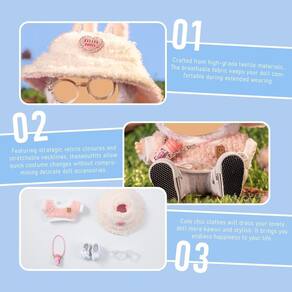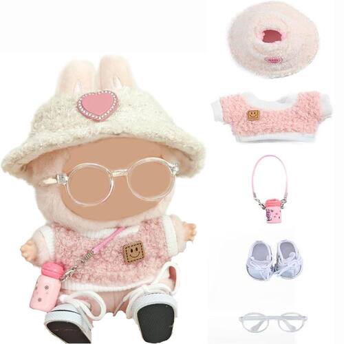 Conjunto de roupas de boneca de 17 cm e acessórios para bonecas — roupa kawaii completa com chapéu em forma de coração, blusa+calça, garrafa e sapatos para bonecas modernas de 7 polegadas, sem boneca incluída