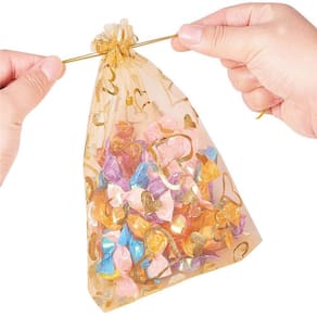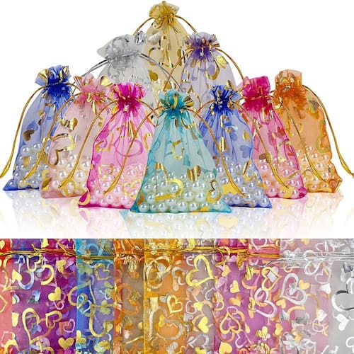 Material: Tamanho do fio: pequeno 9* 12 cm, grande 13* 18 cm Peso: 5g Quantidade: 100 unidades • Design romântico em folha de coração: apresenta padrões de coração dourados cintilantes em organza de malha transparente, oferecendo uma aparência charmosa e alegre, ideal para casamentos, aniversários, celebrações e embalagens decorativas. • Material macio e leve: feito de tecido de malha delicado que é respirável, macio e semitransparente, adequado para exibir joias, sabonetes, cosméticos, amostras ou pequenos itens feitos à mão. • Dois tamanhos versáteis: inclui bolsas de 9 × 12 cm e 13 × 18 cm, oferecendo opções flexíveis para doces , acessórios, pulseiras, ornamentos, lembranças e embalagens com tema de festa. • Fecho seguro com cordão: cada bolsa é equipada com cordões de cetim fortes para facilitar a abertura e o aperto, garantindo o uso conveniente durante eventos, armazenamento doméstico ou vitrines de varejo. • Mistura multicolorida brilhante: oferece uma variedade vibrante de cores para combinar com diferentes temas, tornando essas bolsas perfeitas para celebrações, feiras de artesanato, ocasiões de presentes e decoração sazonal.