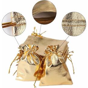 Material: Tecido revestido Tamanho: Pequeno 13x18cm Peso: 3g Quantidade: 100 unidadesTecido revestido metálico: Feito de tecido leve revestido com acabamento em ouro e prata brilhantes, oferecendo uma aparência festiva e elegante para pequenos itens ou acessórios. Fecho conveniente com cordão: cada sacola de presente inclui um cordão macio que protege bem o conteúdo, ideal para joias, pingentes, miçangas, bugigangas, lembranças ou pequenos artesanatos. Armazenamento sem poeira: o interior macio ajuda a evitar arranhões, mantendo os itens limpos e protegidos durante viagens, eventos ou armazenamento de longo prazo. Pacote a granel para vários usos: inclui 100 unidades em cores metálicas mistas, prático para festas, celebrações, embalagens comerciais, itens feitos à mão e organização pessoal. Tamanho compacto e versátil: o tamanho 13 × 18 cm serve para pequenos ornamentos e acessórios sem ocupar espaço, adequado para eventos temáticos, toques de decoração ou expositores de embalagens.