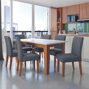 O conjunto Mesa Miami com 6 Cadeiras Trieste é ideal para quem busca sofisticação, conforto e funcionalidade. Com design contemporâneo e acabamento elegante, se adapta a diversos estilos de decoração. A mesa conta com tampo em MDF com verniz vítreo, que proporciona brilho e proteção, além de base também em MDF, garantindo estabilidade e durabilidade. As cadeiras, com estrutura em MDF e tecido Veluplus, oferecem um toque agradável e conforto por meio de assentos e encostos acolchoados com espuma D20.