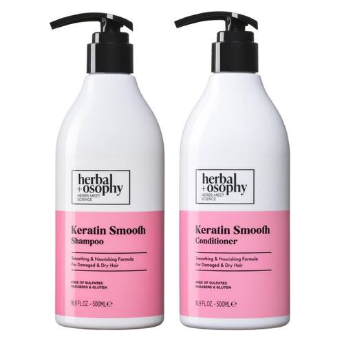 Shampoo e condicionador Herbalosophy Keratin Smooth A coleção Keratin Smooth é enriquecida com vitaminas e proteínas essenciais para desembaraçar, suavizar e hidratar. Esta fórmula nutritiva e sedosa adiciona um brilho luminescente aos cabelos secos ou danificados para uma aparência bonita. Este condicionador rico é infundido com proteína de queratina para um couro cabeludo saudável e cabelos mais lisos. Use após o Shampoo Herbalosophy Keratin Smooth para uma melhor maleabilidade para domar o frizz e diminuir os emaranhados. Restaura a hidratação, maciez e suavidade do cabelo. Produto Color Safe: Esta combinação de tratamento capilar padrão para salão não contém sulfato, parabeno ou glúten, proporcionando uma experiência suave de lavagem do cabelo e um estilo de vida seguro e saudável. Ingredientes: SHAMPOO: Shampoo: Água (Aqua, Eau), Olefina Sulfonato de Sódio C14-16, Cocamidopropil Betaína, Cocamida Metil Mea, Glicerina, Diestearato de Glicol, Hidroxipropil-Queratina Hidrolisada de Cocodimônio, Copolímero de Acrilatos, Perfume, Cloreto de Sódio, Álcool Benzílico, Fenoxietanol, Laurato de Gliceril, Benzoato de sódio, fosfato de cloreto de cocamidopropil-pg-dimônio sódico, edta dissódico, copolímero de cloreto de acrilamidopropiltrimônio/acrilamida, lactato de sódio, ácido cítrico, Ppg-28-bute-35, lactato de alquila C12-13, pantenol, sorbato de potássio CONDICIONADOR: água (água, água),