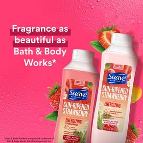 O shampoo e condicionador de morango amadurecido ao sol Suave Essentials, infundido com extrato perfumado de morango e vitamina E nutritiva, transformam cabelos secos e opacos em macios e brilhantes.