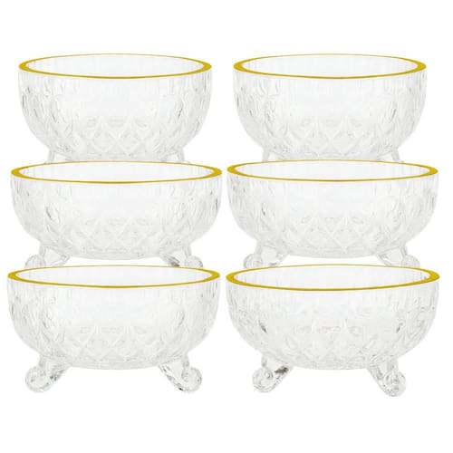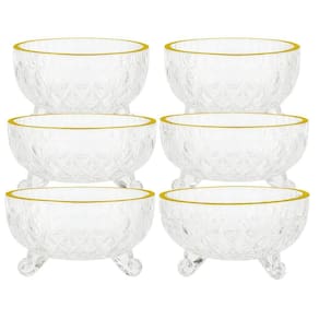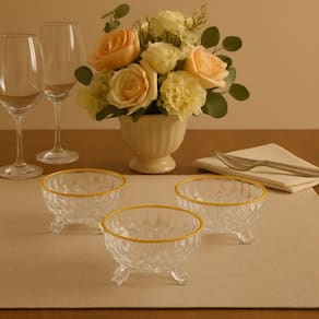Cada peça possui três delicados pés de apoio, que garantem estabilidade e estilo único, ideal para servir frutas, mousses, sorvetes, pavês e muito mais.