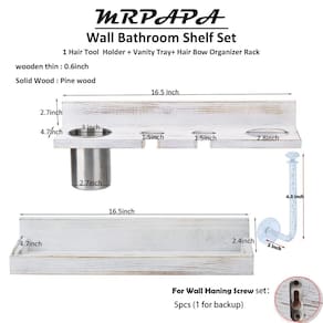Suporte de secador de cabelo de madeira para montagem na parede, organizador de ferramentas de cabelo rústico, bandeja de banheiro de 2 camadas, conjunto organizador de produtos para cabelo com prateleira organizadora de acessórios de cabelo -?Suporte rústico para secador de cabelo?? O conjunto organizador de banheiro inclui bandeja de banheiro de madeira de 2 camadas e rack de parede transparente (organizador de joias com laço de cabelo). fornece espaço de armazenamento suficiente para acessórios de cuidado de cabelo. Mantenha todas as suas ferramentas de cuidado de cabelo separadas, organizadas e fáceis de descobrir. -?Organizador de ferramentas de cabelo perfeito?? Existem 4 compartimentos para as ferramentas de cabelo descansarem. O material de madeira é seguro para o resfriamento das ferramentas de cabelo. Outra bandeja de penteadeira pode organizar mais acessórios de banheiro. O rack de parede transparente organiza a faixa de cabelo com facilidade. -?Organizador de acessórios de cabelo de qualidade?? O suporte para secador de cabelo rústico Farmhouse é feito de madeira de pinho natural, durável e requintado. Comprimento de cada bandeja de parede de madeira: 16,5 polegadas, largura 4,7 polegadas, altura: 2,7 polegadas. O organizador de aparelhos de cabelo deve ter. -?Prateleira de parede para secador de cabelo?? O organizador de ferramentas de modelagem e cuidados com o cabelo montado na parede vem com parafusos de montagem, fáceis de instalar na parede do banheiro. Conveniente - a altura da bandeja pode ser ajustada conforme sua solicitação. -?Compra sem complicações?? Estamos comprometidos em fornecer aos clientes um suporte de secador de cabelo de 100% de qualidade montado na parede. Se o suporte de chapinha de fazenda apresentar algum defeito, devolva ou substitua em 30 DIAS, sem motivo. - ??Dicas de montagem de porta-secador de cabelo rústico?Aqui está uma dica para fazer a colocação das âncoras: coloque uma tira de fita adesiva na parte traseira da prateleira, cobrindo os suportes de parede. Faça um pequeno orifício (ou marque com uma caneta) onde os parafusos entrarão nos suportes. Remova cuidadosamente a fita adesiva. Agora coloque-o na parede e faça furos para as âncoras diretamente na fita, e seu posicionamento será perfeito.