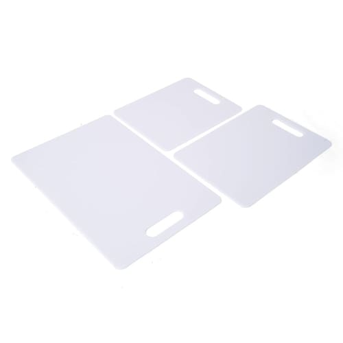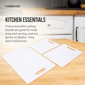 Farberware Conjunto de tábuas de corte de plástico, lava-louças - Tábua de cortar de poliéster segura para cozinha com alças de fácil aderência, conjunto de 3, branco - Livre de BPA: este conjunto de tábua de corte é feito de plástico polipropileno livre de BPA. O material de poliéster não é absorvente, não poroso e não abriga odores, manchas ou bactérias nocivas. É suave com facas, evitando que suas lâminas fiquem cegas rapidamente - Reversível: esta tábua de corte é reversível para dobrar a superfície de corte e possui um orifício de mão para maior controle e estabilidade - Versátil: este conjunto de tábuas de corte é perfeito para qualquer preparação de alimentos, desde fatiar frutas até picar legumes. É um conjunto ideal para iniciantes de cozinha, presente de inauguração de casa ou essencial de volta às aulas. Estas tábuas de corte dão ao usuário o máximo de espaço necessário para cortar sem fazer bagunça no balcão - O conjunto inclui: Este conjunto inclui uma tábua de corte grande: 28 cm por 41 cm, tábua de corte média: 23 cm por 33 cm e uma tábua de corte pequena: 21,6 cm por 28 cm - Fácil de limpar: esta tábua de corte pode ser lavada na lava-louças para facilitar a limpeza e manutenção sem problemas