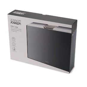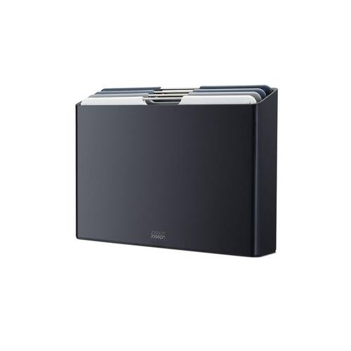 Joseph Joseph Conjunto de 4 peças de tábuas de corte codificadas por cores, grande - grafite - Capa fina para armazenamento organizado - Design em camadas e barras de aço inoxidável nas placas para facilitar a seleção - Tábuas de dupla face com superfícies de corte texturizadas amigáveis à faca e pés antiderrapantes - A capa segura as placas separadamente, permitindo que o ar circule. Cuidados e uso: tábuas - lavável na lava-louças. Capa - limpe com um pano macio e úmido. A superfície amigável das tábuas é projetada para marcar ligeiramente durante o uso. Livre de BPA - Tamanho do quadro: 24 x 34 cm (9 x 13 polegadas)