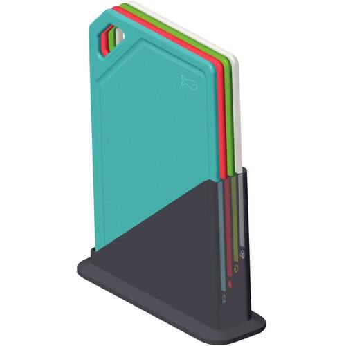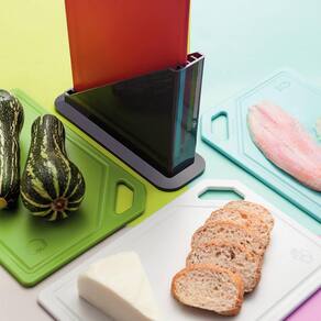 Garantia: 90 dias / Peso total: 1,440kg / Cor predominante: colorido / Ref: 7891112228436; Dimensões do suporte: 16,7cm (C) x 6,5cm (L) x 16,7cm (A); Dimensões de cada tábua: 29cm (C) x 19,9cm (L) x 0,7cm (A); Materiais: polipropileno e ABS; Conteúdo: 4 tábuas de corte e 1 suporte.