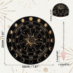Introdução: Placa de pêndulo de bruxa, incluindo placa de pêndulo de madeira com padrões projetados por designers independentes, 1 peça pêndulo radiestesante de cristal de quartzo rosa natural. Sobre o tamanho Placa de pêndulo personalizada: 7,87 x 7,87 x 0,16 polegadas / 200 x 200 x 4 mm Corrente de cabo de aço inoxidável: 15,7 x 0,06 polegadas / 40 x 0,15 cm Pingente: 0,8 x 0,5 pol. / 2,2 x 1,4 cm Sobre o uso 1. Desmagnetizar o pêndulo de cristal antes de usá-lo. 2. Antes de fazer uma pergunta, faça alguns exercícios. 3. No início, faça algumas perguntas com respostas conhecidas. Quando você for proficiente, você pode fazer perguntas desconhecidas. Neste momento, você deve confiar completamente no pêndulo e não fazer perguntas várias vezes. 4. O pêndulo só pode fazer perguntas de múltipla escolha, mas não se limita à dicotomia de certo ou errado, bom ou ruim. Observação: Considere uma diferença de 1 a 3 mm devido à medição manual. Devido à diferença entre diferentes monitores, a imagem pode não refletir a cor real do item. Obrigado! - Adivinhação da placa de pêndulo: a placa de pêndulo metafísica está entre as ferramentas de adivinhação mais usadas e mais antigas. O pêndulo é utilizado como uma maneira de obter uma visão espiritual e material - Excelente qualidade: A placa de radiestesia é feita de madeira de alta qualidade, sólida e durável, que é esculpida com padrões requintados cuidadosamente projetados. O pêndulo de cristal de quartzo rosa é de textura dura e não é fácil de danificar - Design de layout: o sol é frequentemente associado à vitalidade, consciência e masculinidade, enquanto a lua representa intuição, emoções e feminilidade. As estrelas são um símbolo de orientação, inspiração e maior conhecimento - Sobre o uso: A superfície da placa de madeira é projetada com texto, como sim, não, talvez, reformular, para ajudar você a mostrar seu destino. Você também pode fazer perguntas, deixar o pêndulo de radiestesia balançar naturalmente e obter respostas - Presente para bruxa: O kit de tabuleiro de radiestesia é uma ferramenta indispensável para bruxas, que decora perfeitamente a cerimônia do altar da bruxa. É a primeira escolha para presentes para amigos bruxos novatos