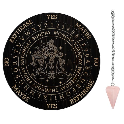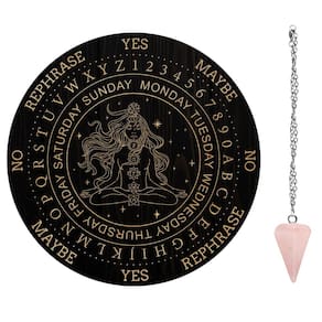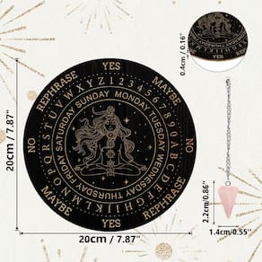 Introdução: Placa de pêndulo de bruxa, incluindo placa de pêndulo de madeira com padrões projetados por designers independentes, 1 peça pêndulo radiestesante de cristal de quartzo rosa natural. Sobre o tamanho Placa de pêndulo personalizada: 7,87 x 7,87 x 0,16 polegadas / 200 x 200 x 4 mm Corrente de cabo de aço inoxidável: 15,7 x 0,06 polegadas / 40 x 0,15 cm Pingente: 0,8 x 0,5 pol. / 2,2 x 1,4 cm Sobre o uso 1. Desmagnetizar o pêndulo de cristal antes de usá-lo. 2. Antes de fazer uma pergunta, faça alguns exercícios. 3. No início, faça algumas perguntas com respostas conhecidas. Quando você for proficiente, você pode fazer perguntas desconhecidas. Neste momento, você deve confiar completamente no pêndulo e não fazer perguntas várias vezes. 4. O pêndulo só pode fazer perguntas de múltipla escolha, mas não se limita à dicotomia de certo ou errado, bom ou ruim. Observação: Considere uma diferença de 1 a 3 mm devido à medição manual. Devido à diferença entre diferentes monitores, a imagem pode não refletir a cor real do item. Obrigado! - Adivinhação de placa de pêndulo: a placa de pêndulo metafísico está entre as ferramentas de adivinhação mais usadas e mais antigas. O pêndulo é utilizado como uma maneira de obter insight espiritual e material. - Excelente qualidade: A tábua de passar é feita de madeira de alta qualidade, sólida e durável, esculpida com padrões requintados cuidadosamente projetados. O pêndulo de cristal de quartzo rosa tem textura dura e não é fácil de danificar. - Design de layout: Deusa e adivinhação são frequentemente interligadas, já que muitas deusas históricas e modernas foram associadas a oráculos, profecias e insights sobre o futuro. A Deusa pode adicionar um senso de mística e encantamento. - Sobre o uso: A superfície da placa de madeira é projetada com texto, como sim, não, talvez, reformular, para ajudá-lo a mostrar seu destino. Você também pode fazer perguntas, deixar o pêndulo de radiofrequência balançar naturalmente e obter respostas. - Presente para bruxa: o kit de quadro de radiofrequência é uma ferramenta indispensável para bruxas, que decora perfeitamente a cerimônia do altar da bruxa. É a primeira escolha de presente para amigos bruxos novatos.