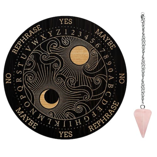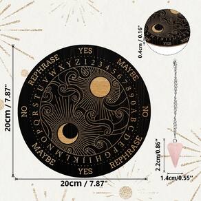 Introdução: Placa de pêndulo de bruxa, incluindo placa de pêndulo de madeira com padrões projetados por designers independentes, 1 peça pêndulo radiestesante de cristal de quartzo rosa natural. Sobre o tamanho Placa de pêndulo personalizada: 7,87 x 7,87 x 0,16 polegadas / 200 x 200 x 4 mm Corrente de cabo de aço inoxidável: 15,7 x 0,06 polegadas / 40 x 0,15 cm Pingente: 0,8 x 0,5 pol. / 2,2 x 1,4 cm Sobre o uso 1. Desmagnetizar o pêndulo de cristal antes de usá-lo. 2. Antes de fazer uma pergunta, faça alguns exercícios. 3. No início, faça algumas perguntas com respostas conhecidas. Quando você for proficiente, você pode fazer perguntas desconhecidas. Neste momento, você deve confiar completamente no pêndulo e não fazer perguntas várias vezes. 4. O pêndulo só pode fazer perguntas de múltipla escolha, mas não se limita à dicotomia de certo ou errado, bom ou ruim. Observação: Considere uma diferença de 1 a 3 mm devido à medição manual. Devido à diferença entre diferentes monitores, a imagem pode não refletir a cor real do item. Obrigado! - Adivinhação de placa de pêndulo: a placa de pêndulo metafísico está entre as ferramentas de adivinhação mais usadas e mais antigas. O pêndulo é utilizado como uma maneira de obter insight espiritual e material. - Excelente qualidade: A tábua de passar é feita de madeira de alta qualidade, sólida e durável, esculpida com padrões requintados cuidadosamente projetados. O pêndulo de cristal de quartzo rosa tem textura dura e não é fácil de danificar. - Design de layout: A conexão entre o sol, a lua, o caos e a adivinhação pode ser encontrada em muitas culturas, onde são frequentemente vistos como símbolos poderosos de criação, destruição e renascimento. O caos entre o sol e a lua traz nova vida. - Sobre o uso: A superfície da placa de madeira é projetada com texto, como sim, não, talvez, reformular, para ajudá-lo a mostrar seu destino. Você também pode fazer perguntas, deixar o pêndulo de radiofrequência balançar naturalmente e obter respostas. - Presente para bruxa: o kit de quadro de radiofrequência é uma ferramenta indispensável para bruxas, que decora perfeitamente a cerimônia do altar da bruxa. É a primeira escolha de presente para amigos bruxos novatos.