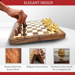 - Design elegante: o lindo conjunto de xadrez de madeira feito à mão é feito de madeira de acácia e lacado de buxo, o que lhe dá uma sensação clássica e artesanal que muitos entusiastas do xadrez apreciarão. O tabuleiro de xadrez magnético é mantido bem fechado com 2 fechos de latão. Cada peça de xadrez é projetada com os melhores detalhes. A caixa de xadrez tem um acabamento superficial liso, o que lhe confere uma aparência polida.