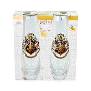 ao mundo mágico Hogwarts está trazendo a você uma experiência gastronômica requintada com este elegante conjunto de vidro. Esta criação mágica vai parecer que você está sendo transportado para o Grande Salão para uma rodada de bebidas. Requintadamente trabalhada, o brasão dourado de Hogwarts adorna esses copos altos de vidro canelados com detalhes encantadores. Elementos decorativos e brilhantes adicionam um toque atraente de capricho. COLEÇÃO DE BEBIDAS PARA POTTERHEADS Coloque estas taças de champanhe sem haste juntas para uma noite mágica para dois. Cada um se encaixa confortavelmente na palma da sua mão para desfrutar de todos os seus favoritos efervescentes. Este utensílio de bar de alta qualidade pode ser utilizado em qualquer ocasião que precise de um toque de encantamento e magia. Aproveite o melhor do Mundo Mágico nesta coleção oficialmente licenciada de Harry Potter. Instruções de cuidado: lavar à mão apenas, não pode ir à máquina de lavar louça, não é seguro