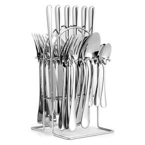 Este conjunto de talheres de 24 peças oferece tudo o que você precisa para suas refeições diárias e ocasiões especiais. Inclui garfos, facas, colheres de mesa e colheres de sobremesa. Este conjunto vem com um suporte que não apenas mantém seus talheres organizados, mas também adiciona um toque de sofisticação à sua cozinha ou sala de jantar. Eles são elegantes e atemporais, combinando perfeitamente com qualquer decoração de mesa.