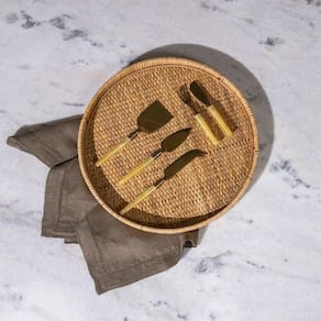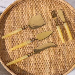 Conjunto De Talheres Copa E Cia Para Queijo 3 Peças Garbo Turim Conjunto de Talheres Copa e Cia para Queijo 3 Peças Garbo Turim - Características Gerais do Produto: - Composição: Composição por linha de talheres:; Rattan: em aço inoxidável gold com cabo de rattan natural.; Atenas: em aço inoxidável gold com cabo de madrepérola.; Monza: em aço inoxidável silver com cabo de resina.; Goldwood: em aço inoxidável gold com cabo de madeira.; Turim: em aço inoxidável gold com cabo de resina.; Ilhéus: em aço inoxidável com cabo de resina.; Bamboo Natural: em aço inoxidável disponível nas versões gold ou silver, com cabo de bambu natural.; Bamboo: em aço inoxidável silver com cabo de bambu natural escuro.; Rattan Natural: em aço inoxidável silver com cabo de rattan. - Detalhes: Design Exclusivo Copa&Cia.; As cores podem sofrer pequenas alterações de cor, variando de monitor para monitor.; Os objetos que ambientam as fotos não acompanham o produto.; As fotos produzidas são apenas como sugestão de uso com as demais peças da coleção.; Cabo de Bamboo - Cuidados: O Atrito entre as Peças pode Danificar o Produto; Lavar com Detergente Neutro e Esponja Macia.; Não Deixar de Molho.; Armazenar em local seco e arejado.; Não podem ser colocados em lava-louças.; Não utilizar solventes, abrasivos ou alvejantes. - Dimensões (cm): Dimensão da Embalagem: Altura: 3 cm, Largura: 14 cm, Comprimento : 17,5 cm Acompanha o produto: - 3 Peças de Talheres para Queijo Garantia: - 7 dias/30 dias contra defeito de fabricação