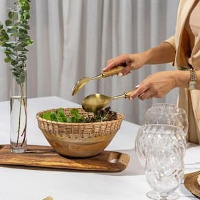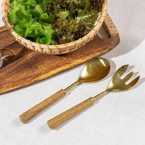 Conjunto De Talheres Copa E Cia Para Salada 2 Peças Garbo Goldwood Conjunto de Talheres Copa e Cia para Salada 2 Peças Garbo Goldwood - Características Gerais do Produto: - Composição: Composição por linha de talheres:; Rattan: em aço inoxidável gold com cabo de rattan natural.; Atenas: em aço inoxidável gold com cabo de madrepérola.; Monza: em aço inoxidável silver com cabo de resina.; Goldwood: em aço inoxidável gold com cabo de madeira.; Turim: em aço inoxidável gold com cabo de resina.; Ilhéus: em aço inoxidável com cabo de resina.; Bamboo: em aço inoxidável silver com cabo de bambu natural escuro.; Rattan Natural: em aço inoxidável silver com cabo de rattan. - Detalhes: Design Exclusivo Copa&Cia.; Produzido na Índia.; As cores podem sofrer pequenas alterações de cor, variando de monitor para monitor.; Os objetos que ambientam as fotos não acompanham o produto.; As fotos produzidas são apenas como sugestão de uso com as demais peças da coleção. - Cuidados: Não Armazenar as Peças Todas Juntas, Poderá Provocar Riscos.; Lavar com Detergente Neutro e Esponja Macia.; Não Deixar de Molho.; Lavar Manualmente; Não podem ser colocados em lava-louças.; Não utilizar solventes, abrasivos ou alvejantes. - Dimensões (cm): Dimensão da Embalagem: Altura:4 cm, Largura: 16 cm, Comprimento: 33 cm Acompanha o produto: - 1 Peças de Colher para Servir Salada1 Peça de Garfo para Servir Salada Garantia: - 7 dias/30 dias contra defeito de fabricação
