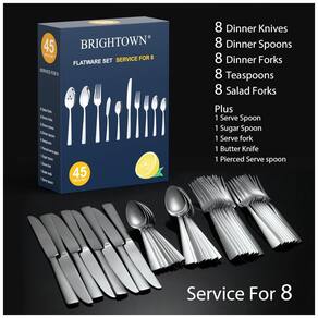 Desfrute de jantares sem preocupações com o Conjunto de Talheres Brightown. Feito em aço inoxidável durável, com design ergonômico que proporciona conforto ao segurar. Este conjunto inclui 8 garfos de jantar, 8 colheres de jantar, 8 facas de jantar, 8 colheres de chá, 8 garfos de salada/sobremesa, além de 1 colher de sopa, 1 garfo de servir, 2 colheres de servir e 1 colher de açúcar. Resistente e elegante, com polimento espelhado que não precisa ser refeito. Fácil de limpar e seguro para máquina de lavar louça.