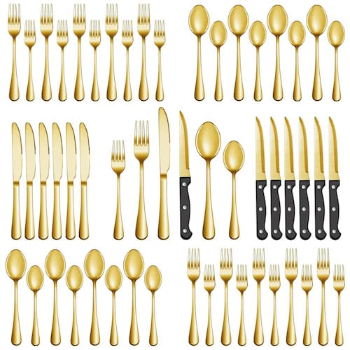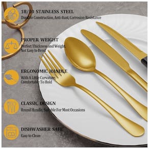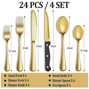 Aprecie a elegância e sofisticação do Conjunto de Talheres de Ouro de 24 peças da MUTNITT! Feito em aço inoxidável de alta qualidade, resistente à corrosão e durável, este conjunto inclui facas de jantar, facas de churrasco, garfos, colheres de jantar, garfos de salada/sobremesa e colheres de chá, essenciais para famílias ou restaurantes. Com um visual único em ouro, esse conjunto se destaca, trazendo um toque retro e vintage à sua mesa. Além disso, o design ergonômico das alças garante máximo conforto durante o uso. Ideal para uso diário, jantares ou festas, este conjunto é uma escolha luxuosa e elegante para criar uma atmosfera nobre em suas refeições. Cuide bem dos seus talheres lavando à mão e evitando materiais de limpeza abrasivos. Adquira já o seu e transforme suas refeições em momentos especiais!