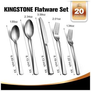 Apresentamos o Conjunto de Talheres em Aço Inoxidável da KINGSTONE, fabricado com aço inoxidável de alta qualidade, oferecendo resistência e equilíbrio ideais. Mais pesado que o normal, porém não excessivamente, não entorta facilmente. Composto por 20 peças para 4 pessoas, é perfeito para uso diário e ocasiões especiais. Seu design elegante e contemporâneo se adapta a qualquer cozinha, com acabamento espelhado lustroso que garante beleza duradoura. Prático de limpar à mão ou na lava-louças, possui bordas lisas e é versátil para diversas ocasiões, sendo a escolha ideal.