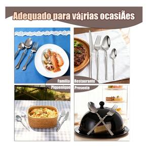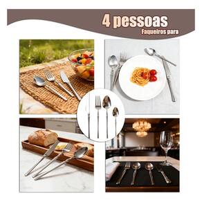 Inclui 4 tipos de talheres (jantar e chá), material resistente, uso para 4 pessoas em ambientes diversos.