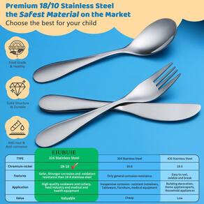 -?Talheres Safe Toddler?Nem todos os talheres infantis de aço inoxidável são criados com aço inoxidável de alta qualidade. O conjunto de garfos e colheres infantis EIUBUIE é feito de aço inoxidável 316 (18/10) da mais alta qualidade, combinação ideal de 18% de cromo e 10% de níquel, o que reduz a chance de erosão. Sólido e durável, sem BPA, sem substâncias nocivas, seguro para o uso diário das crianças, os pais podem ter a certeza de comprá-lo para seus filhos