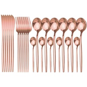 Conjunto De Talheres Slim Rose Gold - Aço Inoxidavel 24 Pçs Envios em 24h Não trabalhamos com entregas do exterior, nosso estoque é 100% nacional Acabamento em PVD não desbota ou descasca Conteúdo da embalagem: Faqueiro com 24 peças rose gold de aço inoxidável. Ideal para jantares elegantes e ocasiões especiais. Feito de material de aço inoxidável de alta qualidade, resistente, durável e brilhante. Uso | Pode ser utilizado em lava-louças. Não é recomendado usar no forno convencional. Limpeza | A limpeza das peças é fácil e prática. É recomendado utilizar sabão, detergente e uma esponja macia. O kit contém: 06 Facas 06 Garfos 06 Colheres de mesa 06 colheres de café Comprimento: Faca: 220mm Colher de mesa:205mm Garfos: 213mm Colher de café: 130mm Marca: Home Dess