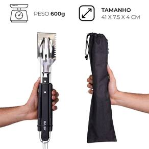- Material: Aço inoxidável e plástico - Acompanha bolsa de armazenamento - Cor: Preto - Medidas: 41cmX 7.5cmx 4cm - Peso:0.600kg