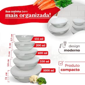 Livre de BPA: As tampas de plástico são livres de BPA, proporcionando segurança e qualidade no armazenamento dos alimentos. Versatilidade: O conjunto é ideal tanto para uso no micro-ondas quanto no freezer, oferecendo praticidade no dia a dia. Vidro de alta qualidade: Feitas de vidro resistente, as tigelas são fáceis de limpar, preservando a higiene e o sabor dos alimentos. Praticidade: Com opções de diferentes tamanhos, este conjunto é perfeito para armazenar, preparar e servir vários tipos de alimentos, tornando-se um item indispensável na sua cozinha.