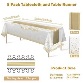 - O que você receberá: o pacote inclui 4 peças de toalha de mesa de plástico branco e dourado e 4 peças de caminho de mesa de cetim dourado, cor específica como mostrado na imagem, boa combinação para você usar na vida diária ou ocasiões importantes melhorando a atmosfera para o seu evento.