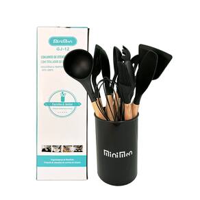 Kit Utensilios de Cozinha Silicone de qualidade alimentar Cabo em Madeira Suporta de - 30 a 230 graus celsius Não tóxico e sem cheiro e silencioso Não Arranha ou Danifica Podem ser lavados à mão ou em máquina lava-louças Conjunto com 12 peças