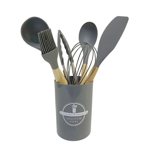 Conjunto De Utensílios Para Cozinha Em Silicone Com Cabo De Madeira 7 Peças Lehaví Cinza -