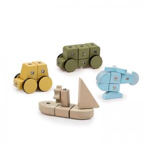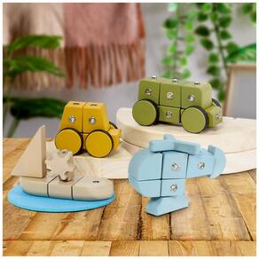 Conjunto infantil de construção em madeira com blocos e conectores metálicos, desenvolvido para montar veículos e estimular a coordenação motora fina, raciocínio lógico e criatividade em crianças a partir de 3 anos. As peças permitem montar modelos de caminhão, carro, barco e helicóptero seguindo os cartões de montagem ou criar combinações livres de veículos imaginários, usando o mesmo sistema de encaixe.?