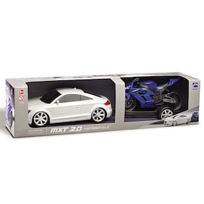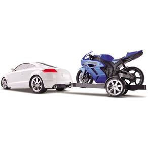 Para deixar a brincadeira ainda mais completa, o conjuntem vem com 01 Carro, 01 Reboque e 01 Moto irada!