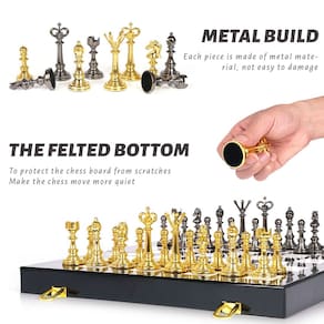 Conjunto de damas e xadrez, feito com amor e gratidão! Um jogo de xadrez ajuda a melhorar as habilidades de pensamento, concentração e consciência de um indivíduo. Ele exercita ambas as partes do cérebro e ajuda você a pensar mais rápido, seja para se divertir ou para competição. Conjuntos de xadrez para adultos ou crianças são algo que todo jogador sério e entusiasta de xadrez deve ter. Com a ajuda de um sistema avançado de gerenciamento de qualidade e dos profissionais mais dedicados, estamos comprometidos em fornecer aos nossos consumidores os conjuntos de tabuleiros de xadrez estritamente testados e melhores possíveis, que são a maneira mais fácil de adquirir um jogo de xadrez coeso, combinando com peças que se encaixam perfeitamente! Projetado com muito cuidado, o tabuleiro de xadrez de madeira é ideal para trazer conforto, classe e estilo à sua vida! Por que nos escolher? Xadrez de qualidade superior para crianças e adultos Habilmente trabalhado Possui material da melhor qualidade Conjunto de damas de xadrez 2 em 1 Inclui 24 damas e peças de xadrez completas Todos os itens de xadrez necessários em um só lugar Traz alegria ilimitada Melhora suas aventuras de jogo de xadrez Seguro, suave e resistente Durável, resistente ao desgaste e de longa duração Peças de xadrez com fundo de feltro Evita arranhões ou danos ao quadro Suave para brincar e mover Tabuleiro de xadrez dobrável e caixa de armazenamento Ajuda a manter as peças de xadrez organizadas Fácil de transportar. Adequado para casa, escola ou escritório Presente maravilhoso Satisfação garantida Uma coisa de alegria para ter e ver, A embalagem inclui: 1 tabuleiro de xadrez portátil. 24 damas 1 conjunto de peças de xadrez 2 x Extra Queens Então, o que você está esperando? Adicione este xadrez de madeira dobrável à sua cesta e prepare-se para melhorar suas experiências! - Materiais de alta qualidade: nosso conjunto de xadrez e xadrez de metal é feito com peças de metal de alta qualidade (liga de zinco) feitas para durar. O tamanho do tabuleiro mede 38 x 38 x 5,5 cm e inclui 32 peças de xadrez de metal e 24 peças de xadrez de metal. Além disso, incluímos 2 Queens extras para promoções fáceis. - Portátil e conveniente: Nosso tabuleiro de xadrez dobrável é fácil de transportar e pode ser jogado em ambientes internos e externos. É um companheiro de viagem perfeito ou um ótimo complemento para sua coleção de jogos em casa. Além disso, é um lindo presente! - Armazenamento seguro: Nosso tabuleiro de xadrez possui um compartimento fixo que oferece amplo espaço para que cada peça de xadrez seja armazenada com segurança dentro do tabuleiro. Cada peça é protegida individualmente em seu próprio compartimento de moldagem, garantindo que permaneçam no lugar e intactas durante o transporte. - Design exclusivo e elegante: nosso conjunto de xadrez e xadrez de metal apresenta peças cromadas e de metal com um brilho especial que dura anos. O tabuleiro de xadrez maravilhosamente marmorizado ficará deslumbrante em sua casa como uma peça central decorativa ou como parte de sua coleção de jogos. - Diversão para todas as idades: nosso conjunto de xadrez e damas é adequado para adultos e crianças, fornecendo uma ferramenta útil para inspirar e estimular a inteligência. É um presente perfeito para aniversários, Dia de Ação de Graças, Natal, Hanukkah, Ano Novo e muito mais.