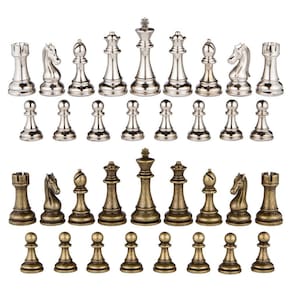 As peças de xadrez extra pesadas Júpiter do Best Chess Set com rainhas extras são ótimas na mão e são cuidadosamente criadas para o jogador de xadrez sério. O peso total deste conjunto vem com 1,8 kg de peso para que você aproveite a sensação de cada peça em sua mão enquanto derrota o seu oponente movimento por movimento. Se você ainda quiser que sejam ainda mais pesadas, estas peças têm um núcleo oco para que você possa adicionar seus próprios pesos. Estas peças de metal são feitas de uma liga de zinco durável com acabamento galvanizado em bronze e prata. Além disso, elas são acolchoadas na parte inferior para proteger sua prancha. O rei tem 10 cm de altura com uma base de 4 cm de diâmetro, então este conjunto é feito para um tabuleiro grande a extra grande (vendido separadamente). Certifique-se de medir nossas dimensões declaradas para ver se elas se encaixam às suas necessidades antes de fazer o pedido. Vem em embalagem de varejo. Best Chess Set é uma empresa sediada na Califórnia e este produto é montado na China em nossa própria fábrica de qualidade controlada. - Um conjunto completo de peças de xadrez de metal com duas rainhas extras (34 peças no total) - Altura King: 10 cm (tamanho extra grande/torneio), diâmetro da base King: 4 cm, peso King: 99 g, altura do peão: 5,3 cm, diâmetro da base do peão: 3 cm, peso do peão: 34 g (verifique se as dimensões se encaixam às suas necessidades antes de comprar) - Peso total das peças do jogo: 1,8 kg (extra pesado) - Tipo de peça de xadrez: metal (liga de zinco) em acabamento prata e bronze, extra pesado, fundo acolchoado - Apenas peças (o quadro não está incluído). As peças de xadrez têm um núcleo oco para que você possa adicionar seus próprios pesos para torná-las ainda mais pesadas, se desejar