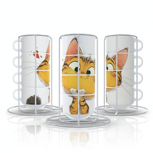 Design Exclusivo e Encantador: Cada xícara apresenta a estampa adorável de um gatinho fofo e flores delicadas, transformando cada gole em um momento de pura alegria. Seus convidados vão se encantar! Qualidade Premium em Cerâmica: Desfrute da durabilidade e do toque suave da cerâmica de alta qualidade. Ideal para bebidas quentes e frias, mantendo a temperatura da sua bebida por mais tempo. Organização Inteligente e Otimização de Espaço: Cansado de armários bagunçados? Nosso suporte de metal elegante permite empilhar as 4 xícaras verticalmente, liberando espaço valioso e criando um visual moderno e arrumado no seu "cantinho do café". Capacidade Ideal para o Dia a Dia (150ml): Perfeitas para um café espresso duplo, chá, ou qualquer bebida que peça uma dose de conforto. O tamanho compacto de 5cm de altura é ergonômico e charmoso.