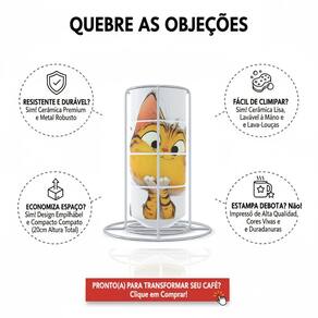 Transforme Seu Cantinho do Café com Charme e Organização! Jogo 4 Xícaras 150ml Cerâmica Empilháveis com Suporte de Metal - Gatinho Fofo Você ama café e adora um ambiente organizado e cheio de personalidade? Apresentamos o conjunto perfeito que vai além de simples xícaras: uma declaração de estilo e praticidade para sua cozinha! Por que você vai se apaixonar por este conjunto:
