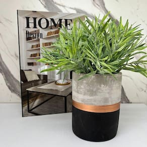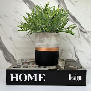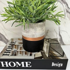 Conjunto decorativo livro de papelão estampa 'Home Design' e vaso preto de cimento artesanal.