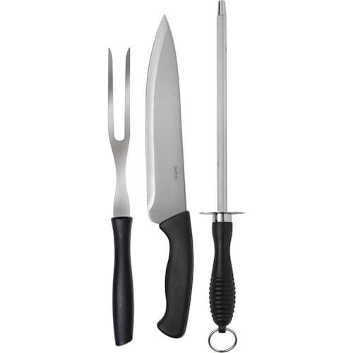 Composição do produto: Cabo em polipropileno e lâmina em aço inox Embalagem individual: Ean 7896020633389 Comprimento 34,1 cm Largura 15 cm Altura 2,7 cm Peso 289 g Tipo de embalagem material blister Itens inclusos na embalagem 1 faca, 1 garfo e 1 chaira Ean: 7896020633389