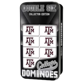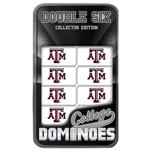 MasterPieces Dia do Jogo – NCAA Texas A&M Aggies – Conjunto de Dominó Duplo com 28 Peças com Logotipo do Time - Produto universitário oficialmente licenciado - Seis dominós duplos embalados em uma caixa de lata colecionável com janela - Inclui 28 dominós de resina com logotipo impresso do time e instruções de jogo - O jogo perfeito para todos os fãs de esportes! - MasterPieces - Uma empresa americana de quebra-cabeças e jogos; garantimos nossos produtos e sua satisfação