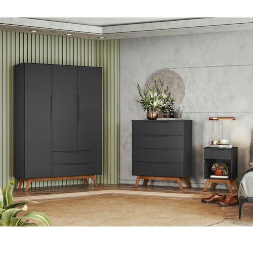 Conjunto de Dormitório Retrô Sonhare Preto com Guarda Roupa 3 Portas e 2 Gavetas, Comoda 4 Gavetas e Mesa de Cabeceira com Gaveta, Estrutura em MDP e MDF, Corrediças Metálicas e Pés em Madeira envernizada; Altura do Conjunto: 182.1 cm Ambiente Principal: Quarto codigo_ean: 7909903400784 Cor: Preto Cor do Produto: Preto Informação Complementar: 1x Mesa de Cabeceira Infantil Retrô 1 Gaveta Alpi Móveis Preto Largura: 40 Altura: 62,6 cm Peso: 10 Profundidade: 37.7 Necessita Montagem: Sim