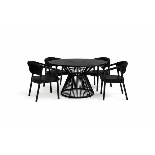 A mesa redonda possui tampo em alumínio ripado, conferindo elegância, leveza visual e excelente resistência às variações climáticas. Sua base é um verdadeiro destaque de design, com estrutura em alumínio combinada à corda náutica, formando um conjunto moderno, imponente e extremamente estável.
