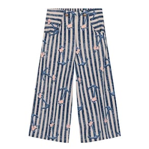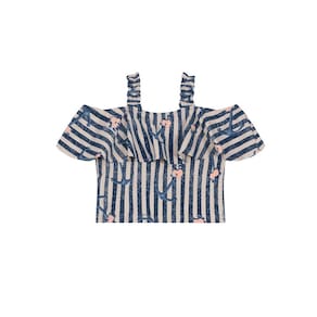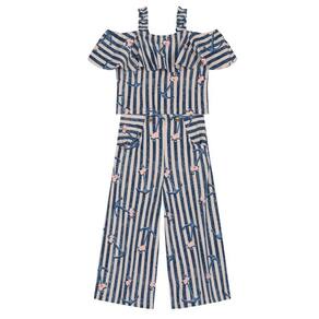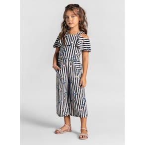 Conjunto composto por blusa e calça confeccionados em cotton. A blusa de modelagem cropped possui alças e mangas curtas com babados e estampa rotativa, já a calça de modelagem pantacourt, conta com bolsos funcionais, estampa rotativa e detalhes de botões.