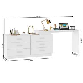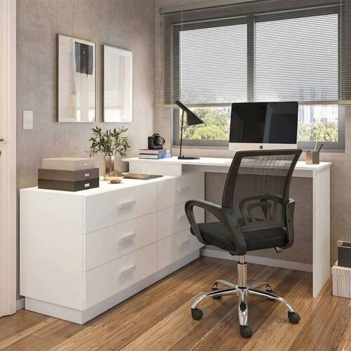 1x Escrivaninha Mesa Escritório em L com Cômoda Leonie 6 Gavetas 138cm Branco Branco